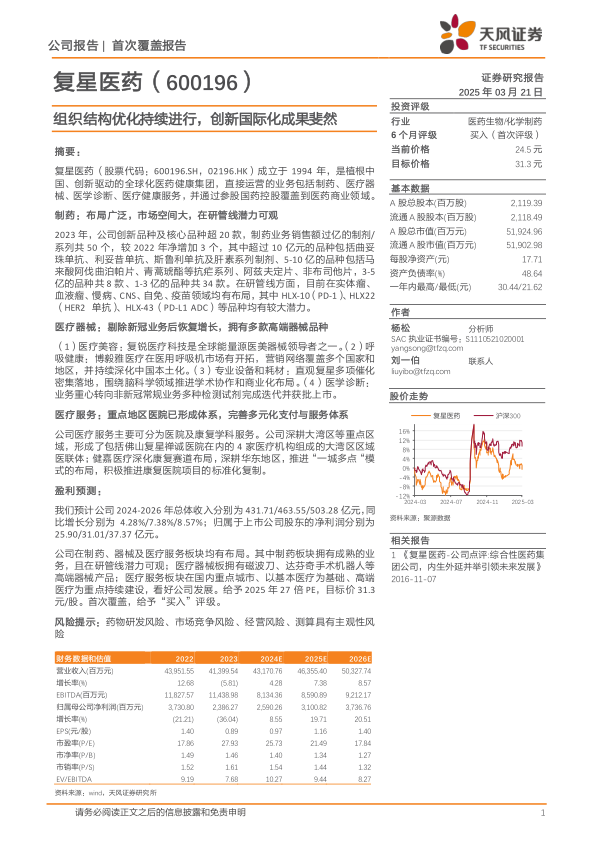 公司在制药、器械及医疗服务板块均有布局。其中制药板块拥有成熟的业务,且在研管线潜力可观;医疗器械板拥有磁波刀、达芬奇手术机器人等高端器械产品;医疗服务板块在国内重点城市、以基本医疗为基础、高端医疗为重点持续建设,看好公司发展。给予2025年27倍PE,目标价31.3元/股。首次覆盖,给予“买入”评级。