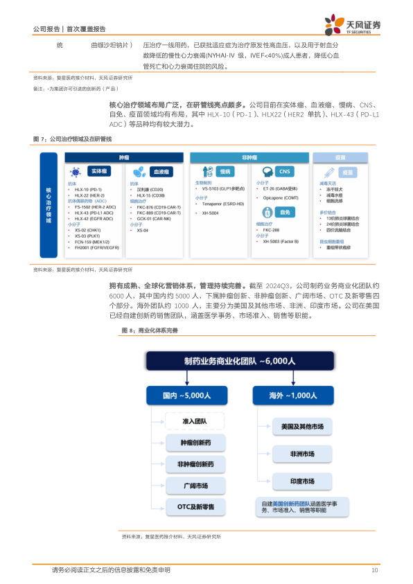2023年,复星医药制药业务拥有超过20款创新及核心品种,销售额过亿的制剂/系列达50个,较2022年净增3个。其中,曲妥珠单抗、利妥昔单抗、斯鲁利单抗及肝素系列制剂销售额超过10亿元。在研管线覆盖实体瘤、血液瘤、慢病、CNS、自免、疫苗等领域,HLX-10(PD-1)、HLX22(HER2单抗)、HLX-43(PD-L1 ADC)等品种潜力巨大。公司拥有约6000人的全球化营销体系,其中国内5000人,海外1000人。2024年上半年,制药板块收入146.8亿元,剔除新冠影响后同比增长1.89%,利润15.71亿元,同比增长10.48%。