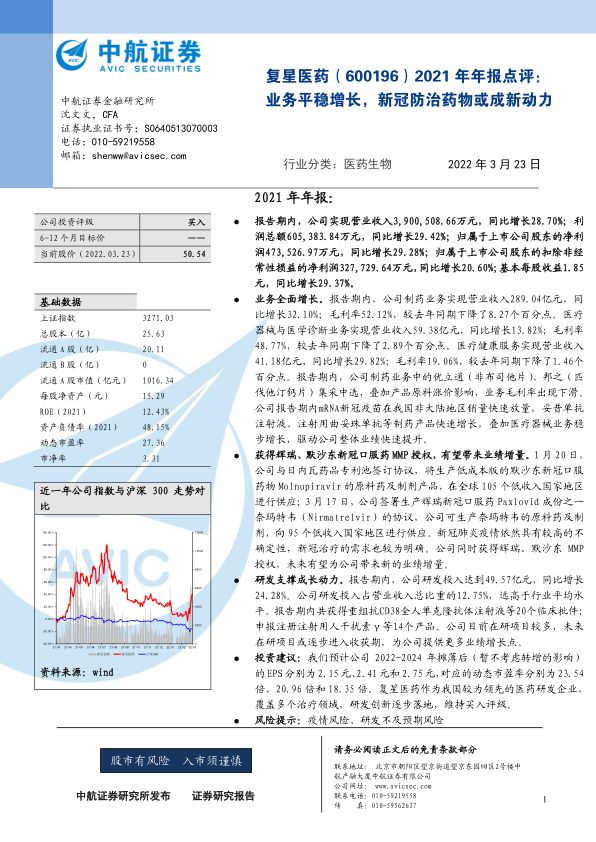 复星医药2021年业绩表现稳健,各业务板块均实现增长。公司积极布局新冠防治药物,获得辉瑞、默沙东口服药授权,有望显著提升业绩。同时,公司持续加大研发投入,为未来发展提供强劲动力。维持“买入”评级,但需关注疫情风险和研发不及预期风险。