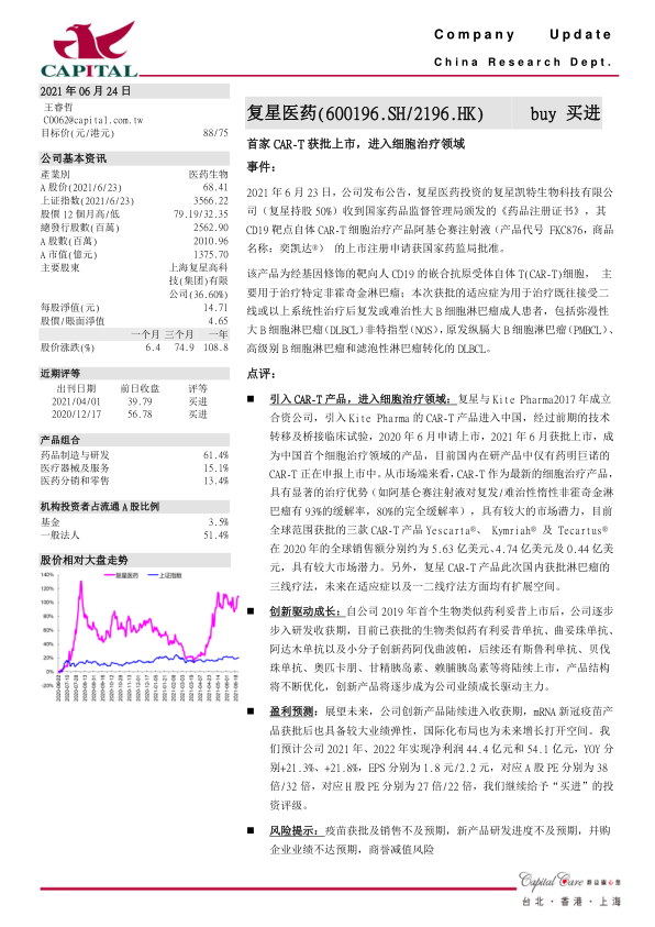 2021 年 6 月 23 日, 公司发布公告, 复星医药投资的复星凯特生物科技有限公司(复星持股 50%) 收到国家药品监督管理局颁发的《药品注册证书》,其CD19 靶点自体 CAR-T 细胞治疗产品阿基仑赛注射液(产品代号 FKC876,商品名称:奕凯达®) 的上市注册申请获国家药监局批准。