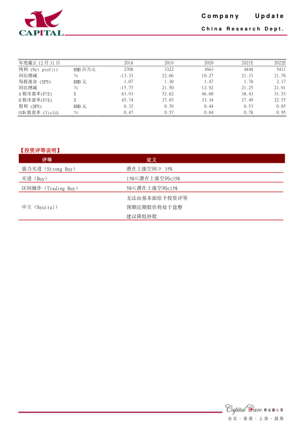 预计公司2021年、2022年实现净利润44.4亿元和54.1亿元,YOY分别+21.3%、+21.8%,EPS分别为1.8元/2.2元,维持“买进”的投资评级。