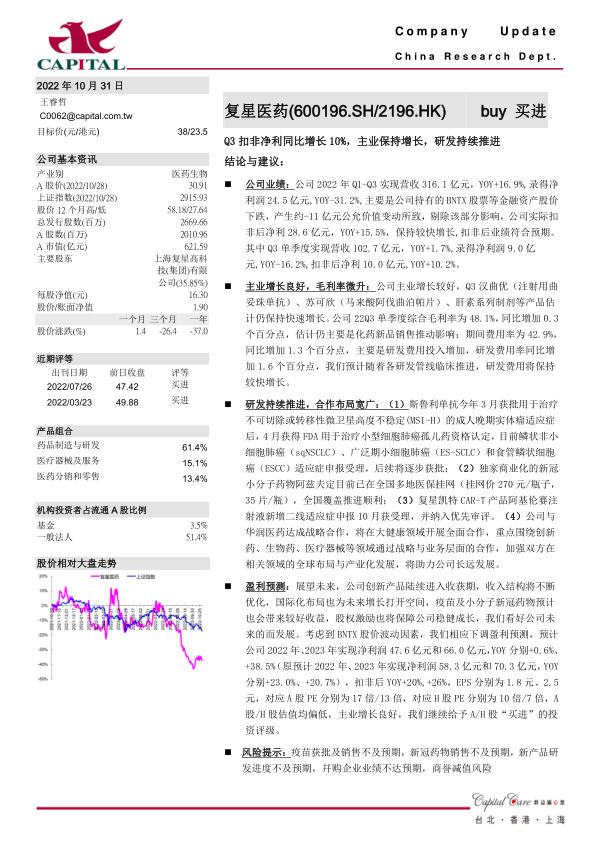 公司业绩:公司2022年Q1-Q3实现营收316.1亿元,YOY+16.9%,录得净利润24.5亿元,YOY-31.2%,主要是公司持有的BNTX股票等金融资产股价下跌,产生约-11亿元公允价值变动所致,剔除该部分影响,公司实际扣非后净利28.6亿元,YOY+15.5%,保持较快增长,扣非后业绩符合预期。其中Q3单季度实现营收102.7亿元,YOY+1.7%,录得净利润9.0亿元,YOY-16.2%,扣非后净利10.0亿元,YOY+10.2%。