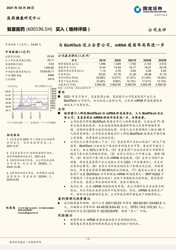 本报告分析了复星医药与 BioNTech 设立合资公司,进一步布局 mRNA 疫苗领域的事件。报告认为,此举巩固了复星医药在该领域的优势,并维持了对公司未来盈利的乐观预期,维持“买入”评级。同时,报告也提示了新药研发、疫苗投建进度以及国家集采政策等潜在风险。