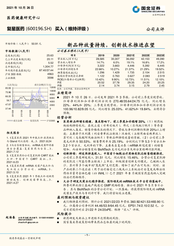 本报告核心观点指出,尽管面临国家药品集中采购(集采)等政策压力,公司在2021年前三季度仍实现了营收和归母净利润的稳健增长,业绩符合市场预期。这主要得益于新品种的持续放量以及制药板块结构的不断优化。同时,公司持续保持高研发投入,推动创新药物的研发与商业化进程,特别是中国首个细胞治疗药物奕凯达的销售稳健推进,以及国际领先的mRNA技术平台有望落地,为公司未来发展注入强劲动力。