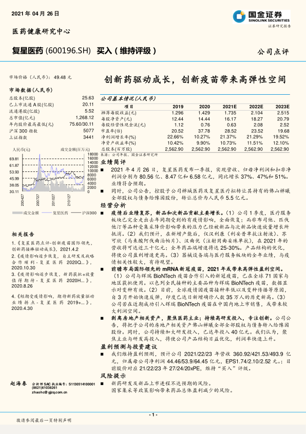 2021 年 4 月 26 日,复星医药发布一季报,实现营收、归母净利润和扣非净利润分别为 80.56 亿、 8.47 亿和 6.58 亿元,同比增长 37%、 47%和 51%。业绩符合预期。