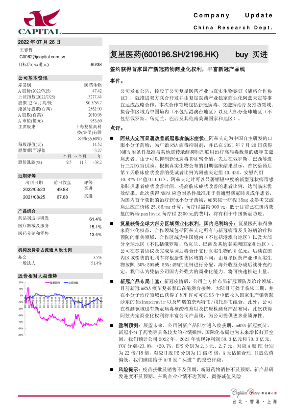 新冠产品布局丰富:新冠疫情后,公司全方位布局新冠预防及诊疗领域,目前新冠mRNA疫苗复必泰已在港澳台接种,大陆目前处于临床二期,并在小分子治疗领域已获得了MPP许可可在95个中低收入国家生产销售默沙东的Molnupiravir以及辉瑞的奈玛特韦/利托那韦组合。此外,公司在检测领域也有新冠病毒核酸检盒以及抗原检测盒产品布局,此次获得阿兹夫定商业化权利将丰富公司产品线,为公司提供更多业绩弹性。