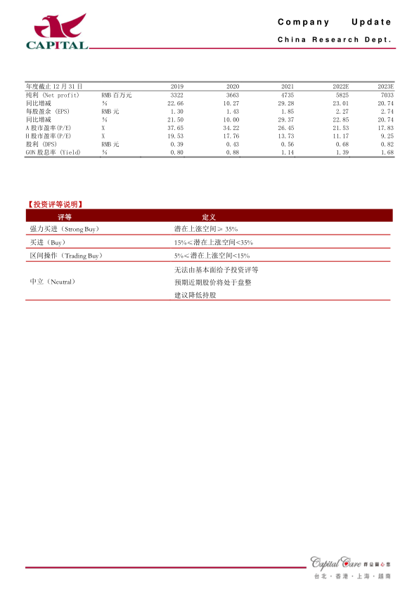 盈利预测:展望未来,公司创新产品陆续进入收获期,mRNA新冠疫苗、新冠小分子药物等具备较大的业绩弹性,国际化布局也为未来增长打开空间。我们预计公司2022年、2023年实现净利润58.3亿元和70.3亿元,YOY分别+23.0%、+20.7%,EPS分别为2.3元、2.7元,对应A股PE分别为22倍/18倍,对应H股PE分别为11倍/9倍,A股估值合理,H股估值偏低,我们继续给予A/H股“买进”的投资评级。