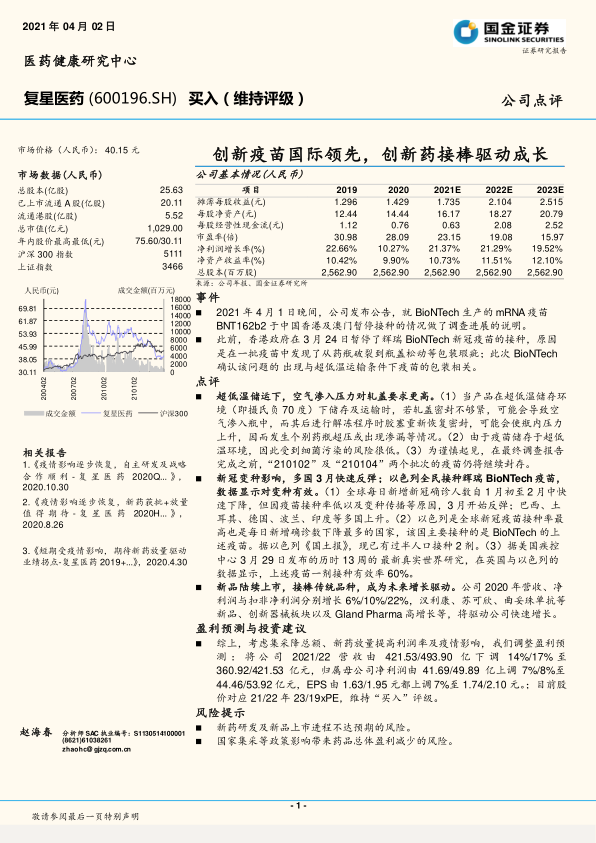 2021年4月1日晚间,公司发布公告,就BioNTech生产的mRNA疫苗BNT162b2于中国香港及澳门暂停接种的情况做了调查进展的说明。