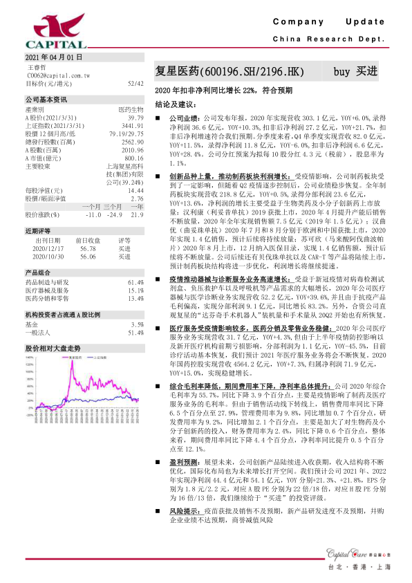 本报告分析了复星医药2020年的业绩表现,指出公司扣非净利润符合预期,创新药和医疗器械业务是增长的主要驱动力。虽然医疗服务业务受到疫情影响,但医药分销业务保持稳健增长。公司通过控制费用,提升了净利率。展望未来,公司创新产品进入收获期,国际化布局打开增长空间,维持“买进”评级。同时,报告也提示了疫苗销售、研发进度、并购业绩和商誉减值等风险。