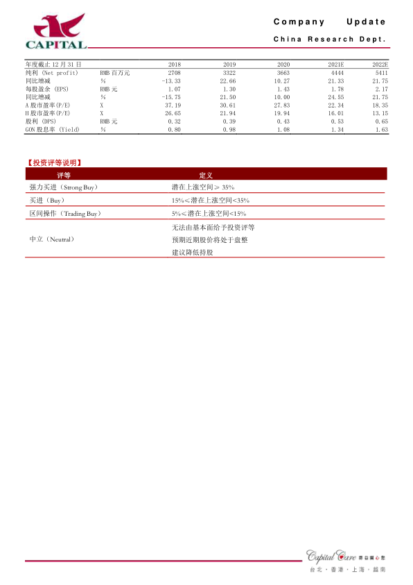 盈利预测:展望未来,公司创新产品陆续进入收获期,收入结构将不断优化,国际化布局也为未来增长打开空间。我们预计公司2021年、2022年实现净利润44.4亿元和54.1亿元,YOY分别+21.3%、+21.8%,EPS分别为1.8元/2.2元,对应A股PE分别为22倍/18倍,对应H股PE分别为16倍/13倍,我们继续给于“买进”的投资评级。