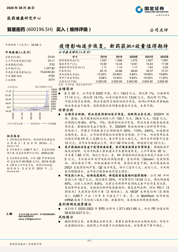 # 中心思想 ## 疫情影响逐步恢复,创新药放量值得期待 * 复星医药2020年中报显示,公司业绩符合预期,药品业务受疫情影响逐步恢复,同时受益于检测和呼吸机等器械业务。 * 创新药获批及销售放量逐步兑现,未来增长潜力巨大。 ## 研发投入加大,创新进展顺利 * 公司持续加大研发投入,多个创新药及生物类似药研发进展顺利,新冠疫苗研发值得期待。 # 主要内容 ## 业绩简评 * **中报业绩符合预期**:公司发布2020年中报,收入140.3亿元,同比下降1%,归母净利润17.14亿元,同比增长13.1%。扣非归母净利润约13.04亿元,同比增长11.7%。 * **疫情影响逐步恢复,创新药业务兑现**:药品受疫情负面影响逐步恢复,检测+呼吸机等器械板块业务受益于疫情,创新药获批及销售放量逐步兑现。 ## 经营分析 * **药品业务逐步恢复,创新药业务兑现**:2020H1制剂、器械、医疗服务版块分别收入约100.1亿元、26.4亿元、13.6亿元,分别同比增-8%、47%、-7%;核心品种非布司他、匹伐他汀、草酸艾司西酞普兰分别增速约62%、110%、245%,加速推动业绩恢复。利妥昔单抗类似物汉利康H1收入2.24亿元,6月单月收入破亿元,预计全年销售可达5-10亿元;汉优曲获批上市,预计H2贡献业绩,峰值预计超10亿元。 * **医疗器械板块受益于疫情快速放量**:达芬奇机器人装机量及手术量快速恢复,上半年装机30台,手术量1.85万例,同比已为正;新冠检测试剂盒及相关产品收入约5亿元,负压救护车及呼吸机均快速放量;复锐科技(Sisram)受疫情影响,同比略有下降,积极拓展新兴市场,疫情后恢复可期。医疗服务板块20Q1受疫情影响严重,Q2逐步恢复,预计全年医疗服务板块有望正增长。 * **研发投入加大,创新进展顺利**:H1年研发投入约16.7亿元,同比增约25%,研发费用约12.04亿元,同比增速超40%,占收入比例约8.6%。新药研发领域主要平台为复宏汉霖、复创等研发品台,生物类似物申报进展顺利。潜在在研品种,例如PD-1(3期临床)及其联合用药方案(3期临床)、抗VEGF生物类似物(3期临床)、CAR-T产品(今年3月报生产)等。与BioNTech合作新冠mRNA疫苗7月份进入临床I期,进展顺利,未来临床结果值得期待。 ## 盈利预测及投资建议 * **盈利预测**:预计2020-2022年EPS分别为1.37/1.63/1.95元,对应PE估值分别38.6/32.6/27.2倍。 ## 风险提示 * 辅助用药目录、医保调出品种目录、带量采购等影响对业绩的风险;研发不达预期的风险;创新药上市销售不及预期的风险;财务费用下降不确定。 # 总结 * 复星医药2020年中报显示业绩符合预期,疫情影响逐步恢复,创新药业务兑现,医疗器械板块受益于疫情快速放量。 * 公司持续加大研发投入,创新药及生物类似药研发进展顺利,新冠疫苗研发值得期待。 * 维持“买入”评级,但需关注辅助用药目录、医保政策、研发风险及创新药销售风险。