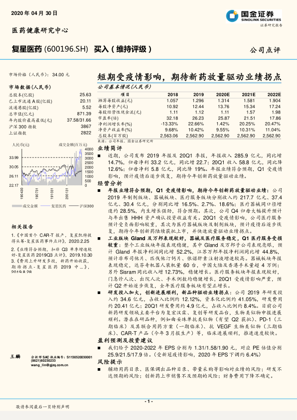 本报告分析显示,复星医药在2019年实现了稳健的业绩增长,但2020年第一季度受新冠疫情影响,短期内业绩承压。公司多元化的业务板块,包括工业制剂、医疗器械和医疗服务,在2019年均表现良好,特别是工业板块的Gland和万邦子公司贡献突出。公司持续高额的研发投入已形成丰富的创新药管线,多个生物类似药和创新药的临床进展顺利,有望在未来驱动公司业绩实现拐点。尽管面临政策、研发及市场销售等风险,但鉴于其强大的研发实力和多元化的业务布局,市场维持“买入”评级,并预期随着疫情影响的消退和创新药的放量,公司业绩将逐步恢复并实现增长。
