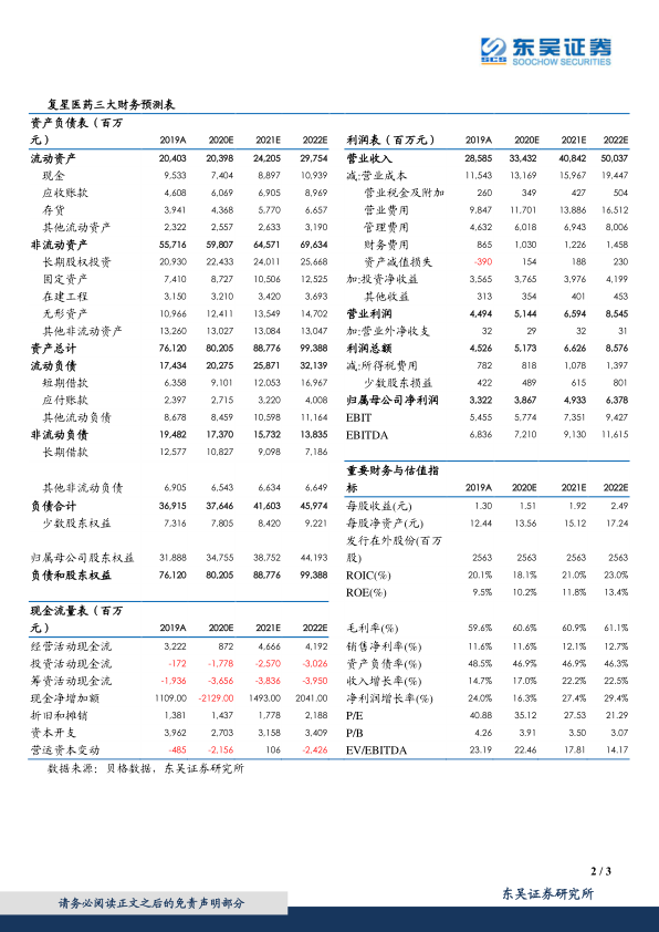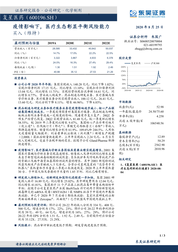 本报告分析了复星医药在疫情影响下的业绩表现,以及其医疗生态所展现出的风险平衡能力。报告指出,尽管疫情对部分业务造成冲击,但公司通过核心产品驱动和医疗器械与诊断业务的高增长,实现了整体业绩的稳定增长。