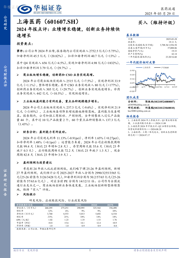 2024年,上海医药实现营业收入2752.5亿元,同比增长5.75%;归母净利润45.5亿元,同比增长20.82%;扣非归母净利润40.7亿元,同比增长13%。
