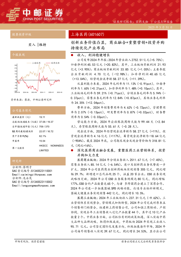 上海医药2024年业绩表现稳健,通过创新业务的拓展和产业布局的优化,实现了收入和利润的增长。公司在医药商业和工业板块均有亮点,尤其在创新药和CSO业务方面表现突出。投资并购的积极推进也有望为公司带来新的增长点。维持“买入”评级,但需关注研发和合作进展的风险。