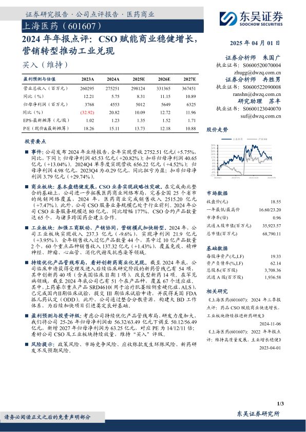 盈利预测与投资评级:考虑公司持续优化产品管线布局,研发力度加大,我们将公司25-26年归母净利润由56.32/63.49亿元下调至50.12/56.49亿元,新增2027年归母净利润为63.25亿元,对应PE为14/12/11倍;看好公司CSO及工业板块持续放量,维持“买入”评级。