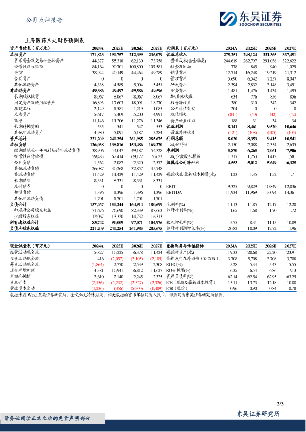 基于公司持续优化产品管线布局和加大研发力度,分析师对公司2025-2026年的归母净利润预测进行了调整,由原先的56.32/63.49亿元下调至50.12/56.49亿元,并新增了2027年归母净利润预测为63.25亿元。调整后的盈利预测对应PE分别为14倍、12倍和11倍。鉴于公司CSO业务和工业板块的持续放量潜力,分析师维持了对上海医药的“买入”评级。同时,报告提示了政策风险、市场竞争风险、应收账款发生坏账风险以及新药研发不及预期风险。