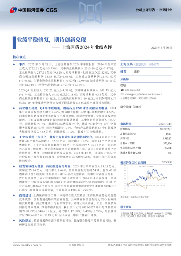 事件:2025年3月28日,上海医药发布2024年年度报告,2024年全年营业收入2752.51亿元(+5.75%),其中商业板块收入2515.20亿元(+7.47%),工业板块收入237.31亿元(-9.62%);归母净利润45.53亿元(+20.82%),其中商业板块贡献利润33.85亿元(+1.05%),工业板块贡献利润21.93亿元(+3.95%),主要参股企业贡献利润4.70亿元(-12.98%);扣非净利润40.65亿元(+13.04%),经营性现金流58.27亿元(+11.39%)。