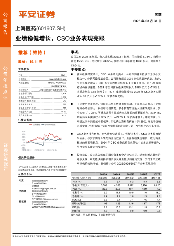 商业板块稳定增长,CSO业务成为亮点。公司医药商业板块作为核心支柱之一,分销网络覆盖全国。公司拥有超过2000家优质品牌药房。此外,公司还成功建设了300多个院内供应链服务(SPD)项目,为129家医疗机构提供服务。2024年公司商业板块实现收入2515亿元(+7.5%),实现净利润33.9亿元(+1.1%),业绩稳健增长;2024年CSO业务实现收入80亿元(+177%),业绩表现亮眼。