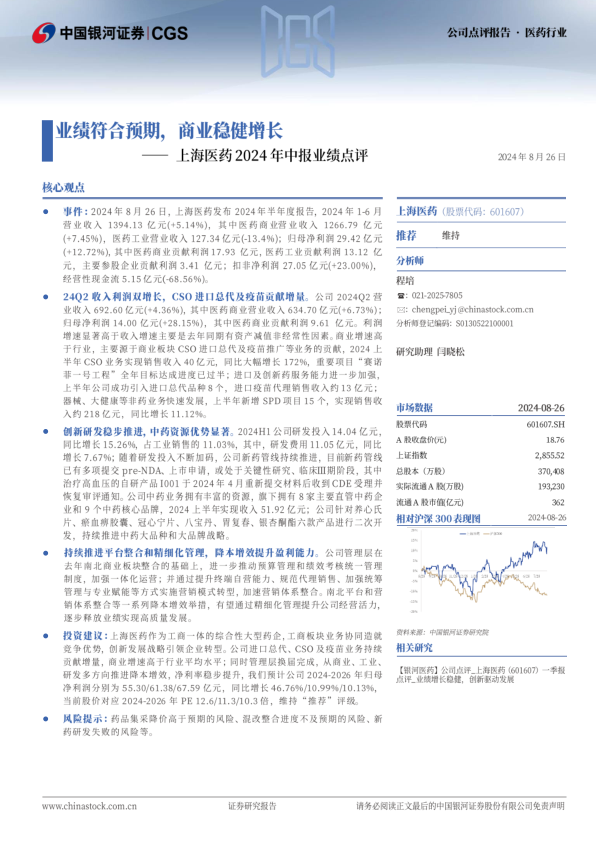投资建议:上海医药作为工商一体的综合性大型药企,工商板块业务协同造就竞争优势,创新发展战略引领企业转型。公司进口总代、CSO及疫苗业务持续贡献增量,商业增速高于行业平均水平;同时管理层换届完成,从商业、工业、研发多方向推进降本增效,净利率稳步提升,我们预计公司2024-2026年归母净利润分别为55.30/61.38/67.59亿元,同比增长46.76%/10.99%/10.13%,当前股价对应2024-2026年PE12.6/11.3/10.3倍,维持“推荐”评级。