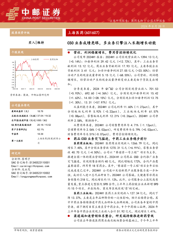 上海医药在2024年上半年展现出强劲的业绩增长势头,营业收入和归母净利润均实现稳健增长,尤其扣非归母净利润增幅显著,反映了公司良好的盈利能力和持续优化的费用管控。药品CSO业务的爆发式增长是上半年业绩的最大亮点,销售额同比激增172%,有效驱动了商业板块的整体发展。同时,公司在渠道端加速营销体系整合,中药工业业务稳步推进,并持续加大研发投入,新药管线进展顺利,特别是自研创新药I001片的高血压适应症NDA申请恢复审评,预示着未来增长潜力。综合来看,上海医药凭借其多业务引擎的增长潜力和持续优化的运营效率,有望实现长期稳健发展,因此报告维持“买入”评级。