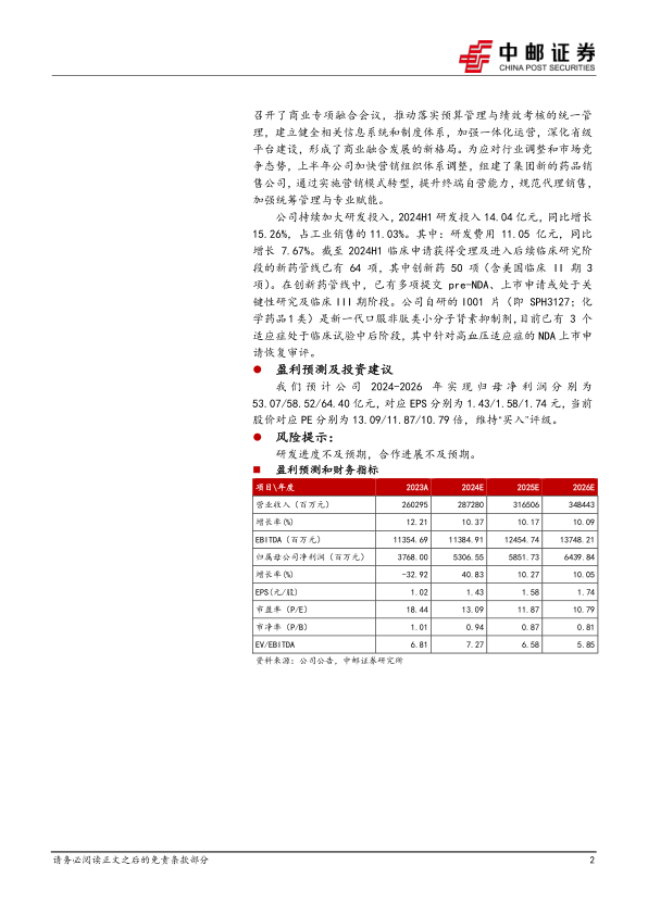 公司持续加大研发投入,2024H1研发投入14.04亿元,同比增长15.26%,占工业销售的11.03%。其中:研发费用11.05亿元,同比增长7.67%。截至2024H1临床申请获得受理及进入后续临床研究阶段的新药管线已有64项,其中创新药50项(含美国临床II期3项)。在创新药管线中,已有多项提交pre-NDA、上市申请或处于关键性研究及临床III期阶段。公司自研的I001片(即SPH3127;化学药品1类)是新一代口服非肽类小分子肾素抑制剂,目前已有3个适应症处于临床试验中后阶段,其中针对高血压适应症的NDA上市申请恢复审评。