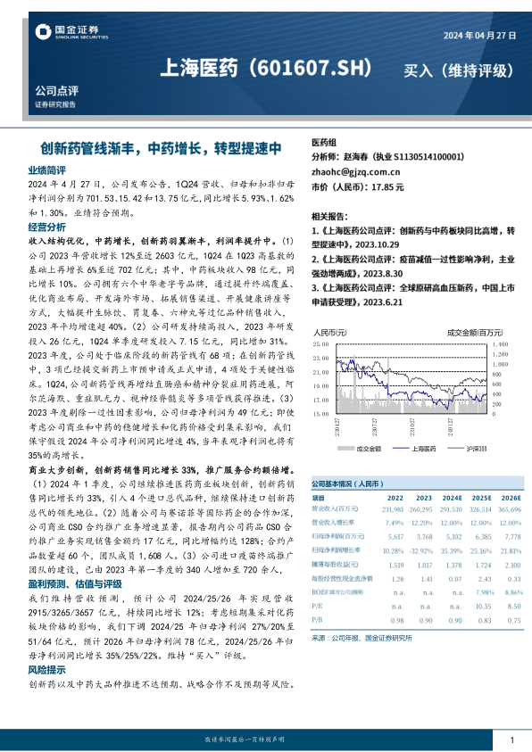上海医药一季度业绩稳健增长,得益于中药板块的良好表现、创新药业务的快速发展以及医药商业板块的创新。公司持续加大研发投入,创新药管线进展顺利,为未来的增长奠定了坚实基础。尽管短期内面临化药集采带来的价格压力,但公司通过优化收入结构和拓展创新业务,盈利能力有望持续提升。国金证券维持对上海医药“买入”评级,看好公司未来的发展前景。
