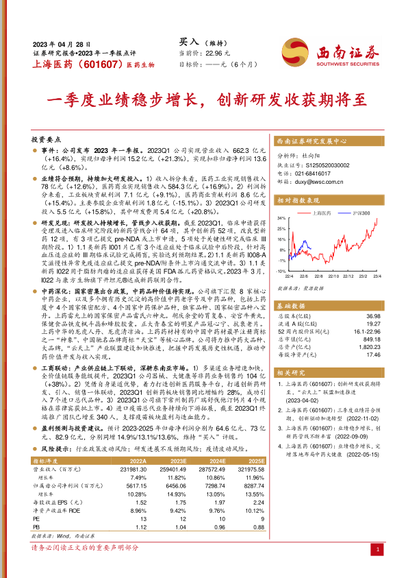 上海医药2023年一季度业绩稳步增长,体现了公司在医药工业和商业领域的协同发展。公司持续加大研发投入,创新药管线进入收获期,有望为未来业绩增长提供强劲动力。同时,公司积极把握中药发展机遇,通过工商联动和国际化拓展,不断提升综合竞争力。维持“买入”评级,建议投资者关注公司未来发展。