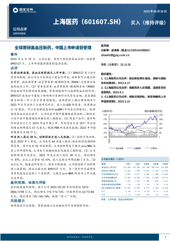 2023年6月19日,公司公告,其用于原发性高血压的一类新药SPH3127片,上市申请获得国家药监局受理。
