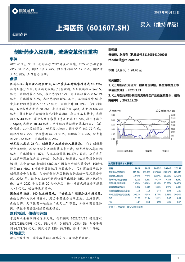 2022年,上海医药凭借医药工业和商业板块的稳健增长,实现了营收和归母净利润的双位数增长,业绩符合市场预期。公司在重点品种销售、创新药研发投入及管线布局方面取得显著进展,创新研发总投入高达28亿元,多款创新药进入关键临床阶段,预示着未来业绩增长的新动能。同时,通过国企改革的深化和“云天上”中药联盟的建立,公司在优化产业结构、拓展中药市场方面展现出积极的战略布局。尽管面临新药研发、商誉减值和战略合作等风险,但市场对其未来营收和利润的持续增长持乐观态度,维持“买入”评级。