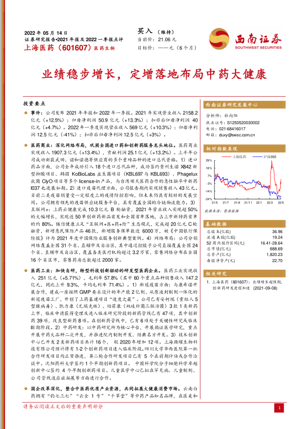 本报告对上海医药(601607)2021年年报和2022年一季报进行了分析,并给出了投资建议。