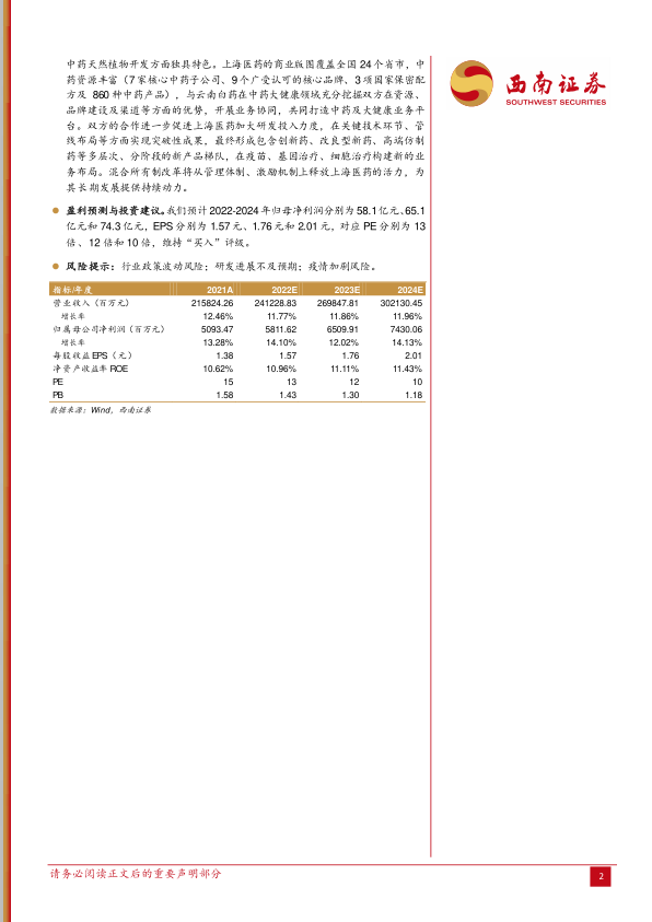 盈利预测与投资建议。我们预计2022-2024年归母净利润分别为58.1亿元、65.1亿元和 74.3亿元,EPS 分别为 1.57元、1.76元和 2.01元,对应 PE 分别为 13倍、12 倍和 10 倍,维持“买入”评级。