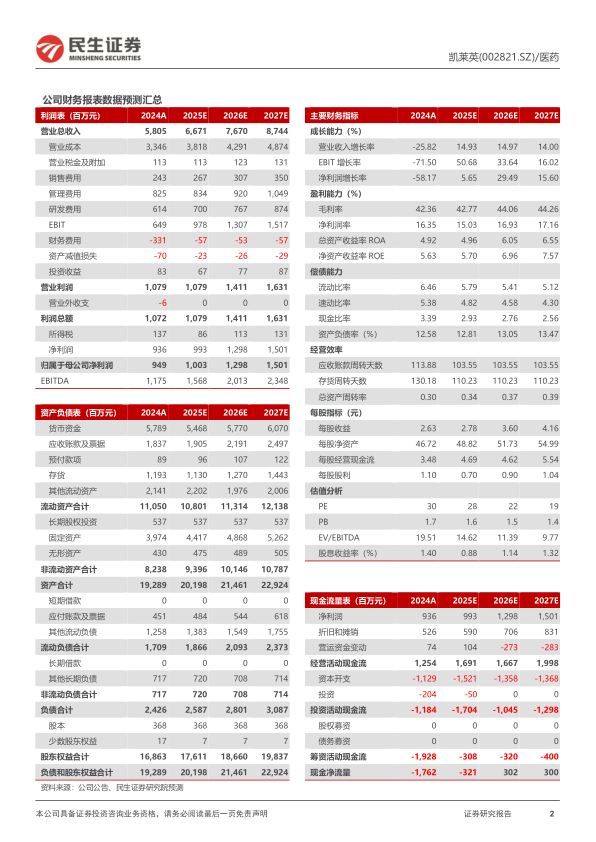 投资建议:凯莱英小分子CDMO业务和新兴业务双轮驱动,未来将加快海外产能布局。我们预计2025-2027年公司营业收入分别为66.71/76.70/87.44亿元,同比增长14.9%/15.0%/14.0%,归母净利润分别为10.03/12.98/15.01亿元,对应PE分别为28/22/19倍,维持“推荐”评级。