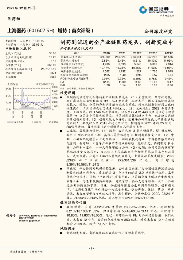 从制药到流通皆处头部的全产业链医药龙头。(1)主营优化:从营收角度,公司商业与工业贡献比为 9:1;从毛利角度,二者各半;因工业端持续高研发投入,短期,公司的净利润贡献六成来自商业,而未来随着创新药占比的快速提升,工业端将成长为未来利润主力。(2 )龙头地位:2022 年前三季度,上海医药,以 1746 亿元营收额,位居全部 A 股 443 支医药医疗个股营收第一;公司是中国最大的药品、疫苗剂医疗器械进口平台,也是处方药新零售创新先行者。(3)创新兑现元年将始:近 6 年公司研发投入保持在 A 股药企前五,研发投入从 2015 年的 6.2 亿元,持续增至 2021 年的 25 亿元;2023 年开始,每年将有 1-2 个创新药大品种提交上市。