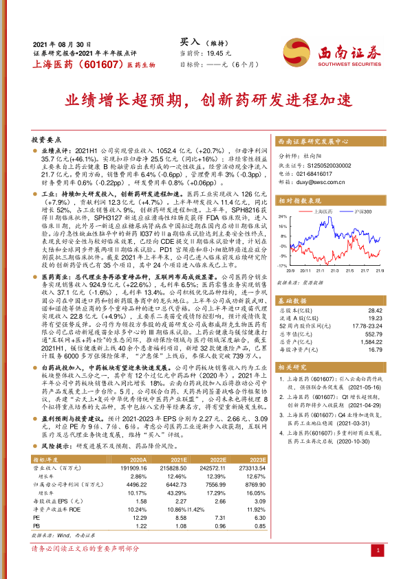本报告对上海医药(601607)2021年半年报进行了深度分析,核心观点如下: