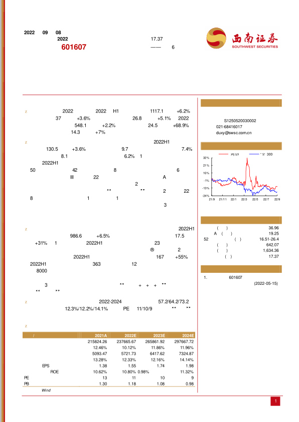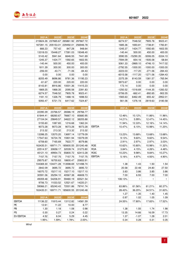 盈利预测与投资建议。我们预计2022-2024年归母净利润为57.2/64.2/73.2亿元,对应增速为12.3%/12.2%/14.1%,对应PE为11/10/9倍,维持“买入”评级。