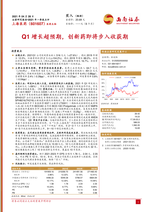 上海医药2021年一季报业绩表现亮眼,营收和利润均实现大幅增长,主要得益于医药工业和医药商业的稳健发展。公司在创新药研发方面持续投入,多个项目进入临床阶段,未来有望迎来收获期。同时,公司积极布局互联网医疗,总代理业务不断拓展,为业绩增长注入新动力。维持“买入”评级,但需关注研发进展和药品降价风险。