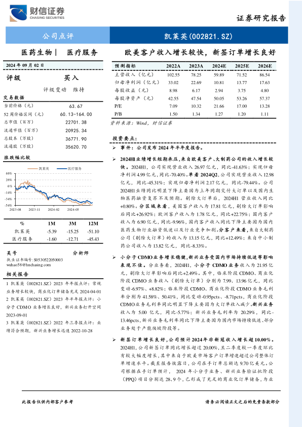 凯莱英2024年上半年业绩虽受大订单交付基数和国内市场环境影响而短期承压,但剔除大订单后,公司在欧美核心市场和大型制药客户的收入均实现稳健增长,显示出其业务的内在韧性。小分子CDMO业务在调整后也保持了增长。更重要的是,公司新签订单在报告期内同比增长超过20%,且欧美市场订单增速突出,在手订单总额达9.70亿美元,为未来业绩增长奠定了坚实基础。公司预计2024年非新冠收入将增长超过10%,并拥有充足的商业化订单储备。鉴于医药生物行业投融资环境的回暖以及公司订单的良好增长态势,财信证券维持凯莱英“买入”评级,并设定了58.80-73.50元/股的目标价格,认为公司业绩有望逐步改善。投资者需关注行业竞争、政策、汇率及订单增长等潜在风险。