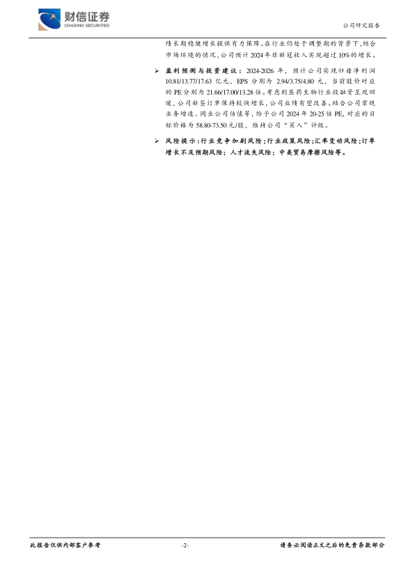 盈利预测与投资建议:2024-2026年,预计公司实现归母净利润10.81/13.77/17.63亿元,EPS分别为2.94/3.75/4.80元,当前股价对应的PE分别为21.66/17.00/13.28倍。考虑到医药生物行业投融资呈现回暖,公司新签订单保持较快增长,公司业绩有望改善。结合公司常规业务增速、同业公司估值等,给予公司2024年20-25倍PE,对应的目标价格为58.80-73.50元/股,维持公司“买入”评级。