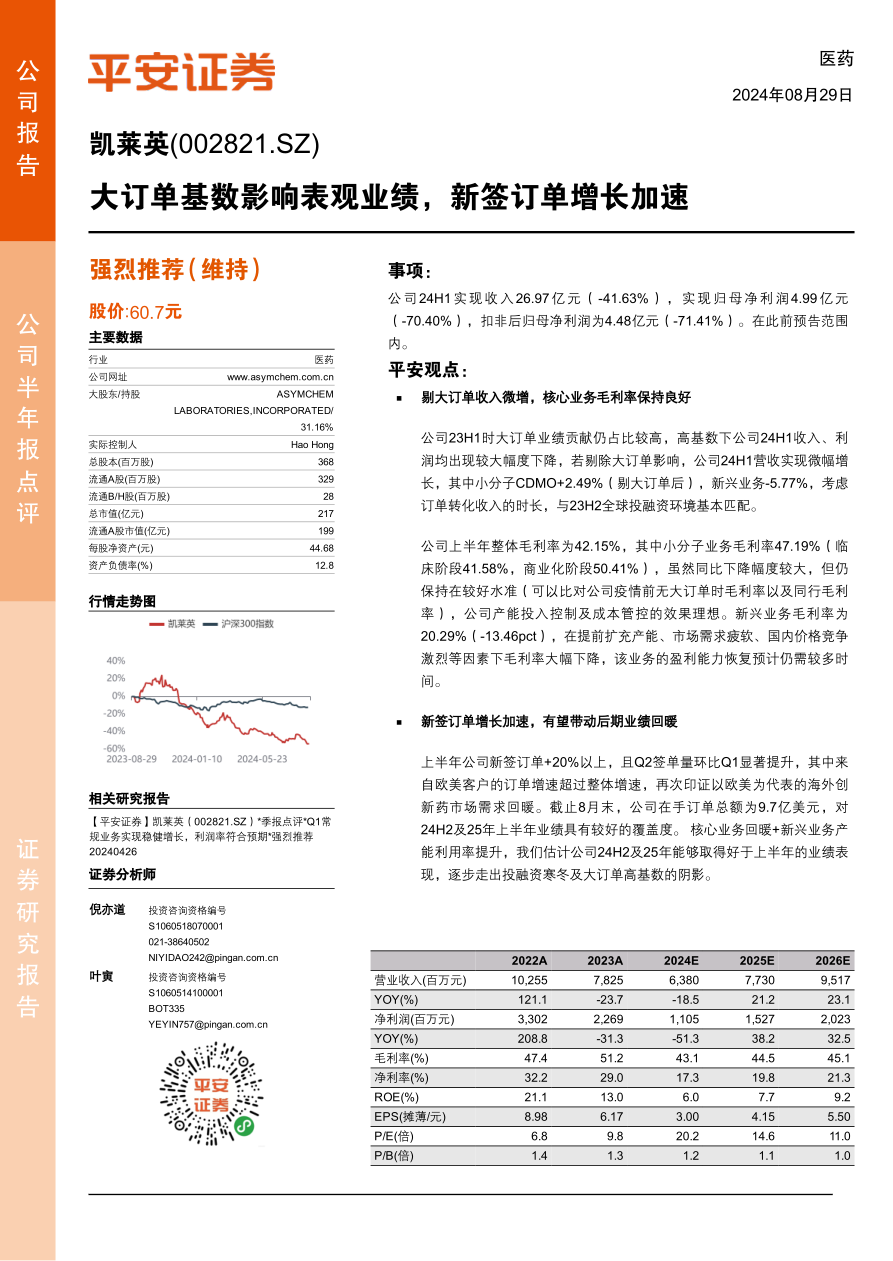 公司23H1时大订单业绩贡献仍占比较高,高基数下公司24H1收入、利润均出现较大幅度下降,若剔除大订单影响,公司24H1营收实现微幅增长,其中小分子CDMO+2.49%(剔大订单后),新兴业务-5.77%,考虑订单转化收入的时长,与23H2全球投融资环境基本匹配。
