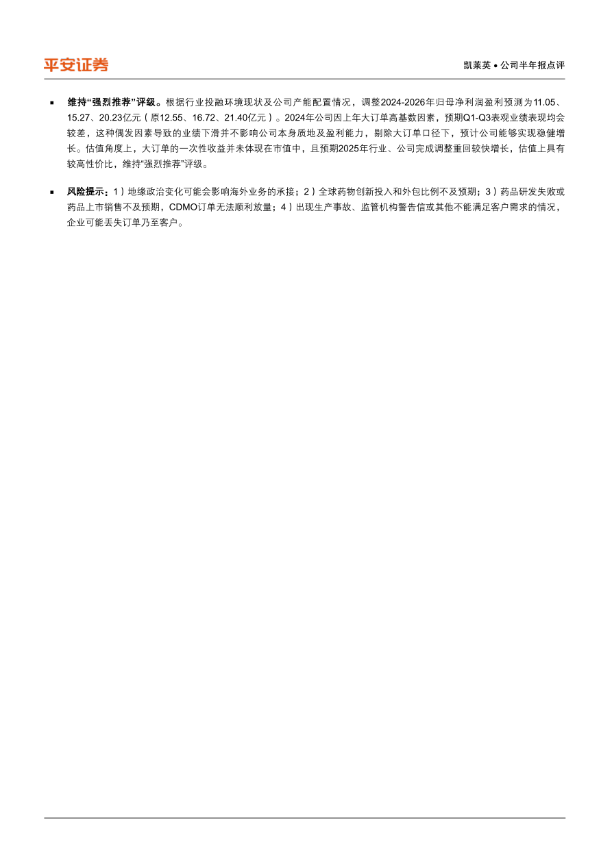 风险提示:1)地缘政治变化可能会影响海外业务的承接;2)全球药物创新投入和外包比例不及预期;3)药品研发失败或药品上市销售不及预期,CDMO订单无法顺利放量;4)出现生产事故、监管机构警告信或其他不能满足客户需求的情况,企业可能丢失订单乃至客户。