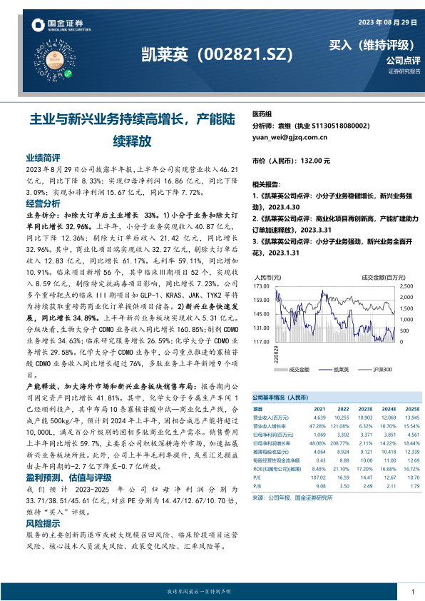 凯莱英2023年上半年业绩受到大订单影响,营收和利润同比下降,但主营业务在剔除大订单后仍保持强劲增长。新兴业务板块表现亮眼,多点开花,为公司贡献新的增长动力。公司持续加大产能投入,积极拓展市场,为未来发展奠定坚实基础。维持“买入”评级,但需关注相关风险。