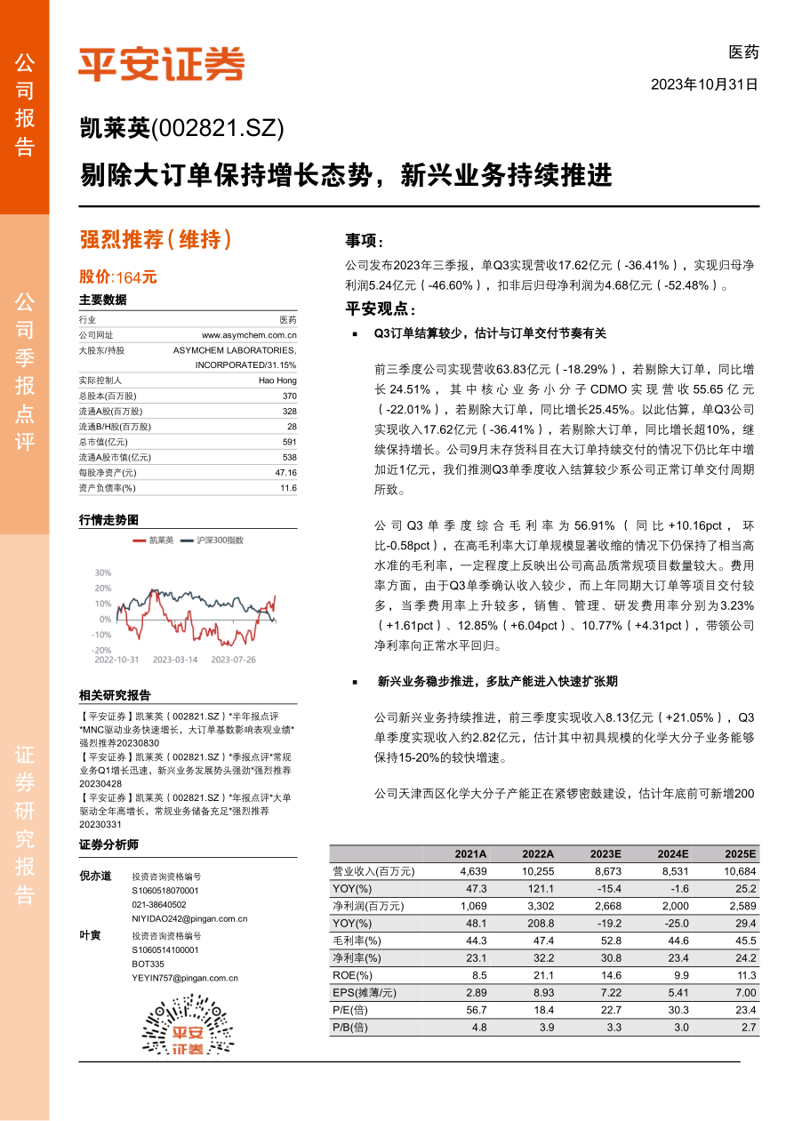 凯莱英三季度业绩受到大订单结算节奏的影响,营收和利润有所下滑。但剔除大订单后,公司核心业务仍保持增长,显示出稳健的经营能力。新兴业务稳步推进,多肽产能扩张为未来增长提供动力。维持“强烈推荐”评级,看好公司在医药投融资改善后的发展前景。