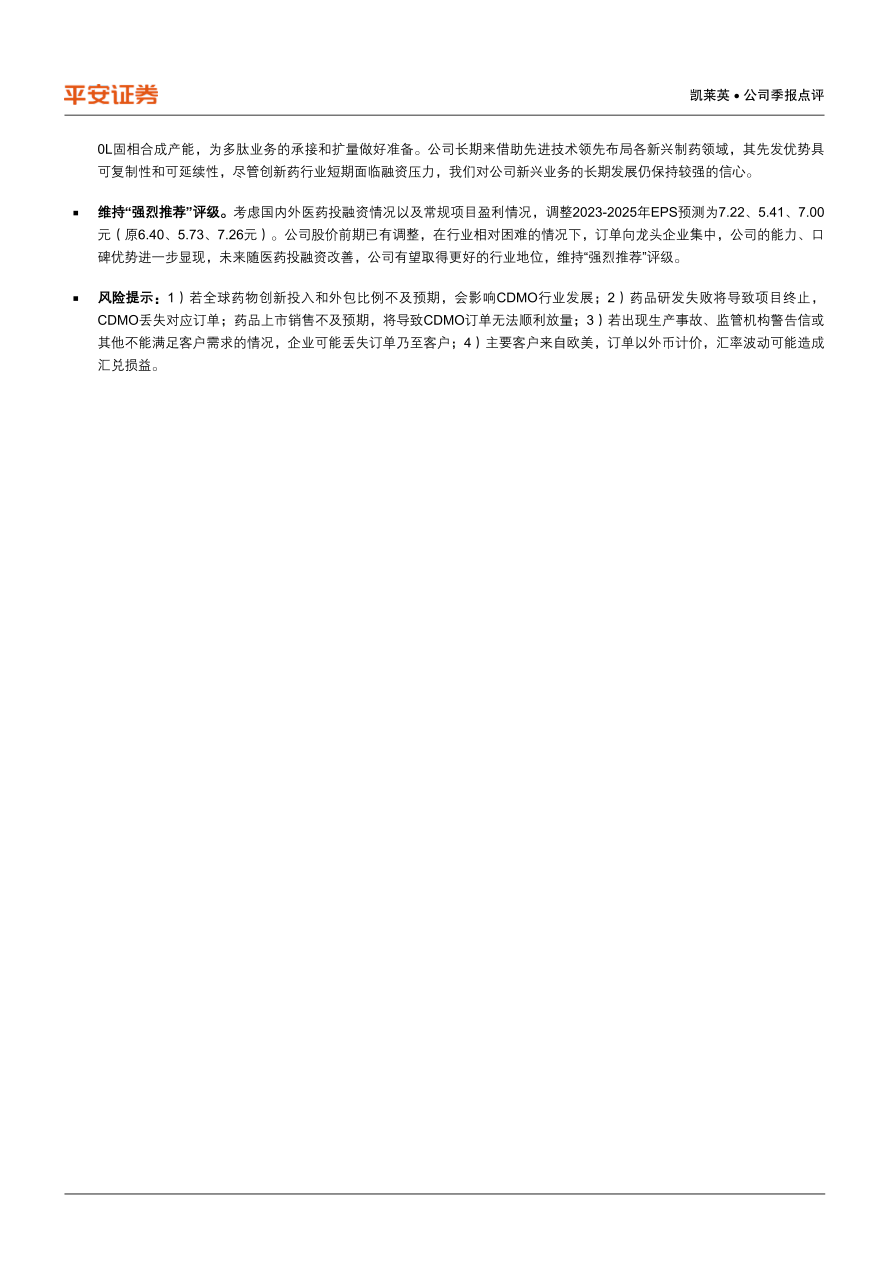 风险提示:1)若全球药物创新投入和外包比例不及预期,会影响CDMO行业发展;2)药品研发失败将导致项目终止,CDMO丢失对应订单;药品上市销售不及预期,将导致CDMO订单无法顺利放量;3)若出现生产事故、监管机构警告信或其他不能满足客户需求的情况,企业可能丢失订单乃至客户;4)主要客户来自欧美,订单以外币计价,汇率波动可能造成汇兑损益。