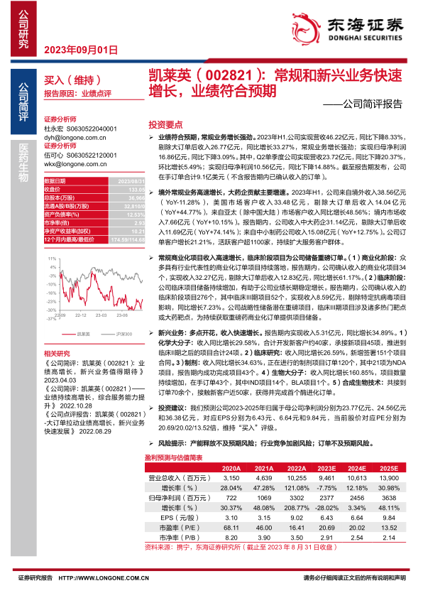 凯莱英2023年上半年业绩符合预期,常规业务保持稳健增长,新兴业务呈现多点开花的良好态势。公司在国内外市场均取得进展,客户结构持续优化,商业化和临床阶段项目储备充足。维持“买入”评级,但需关注产能释放、行业竞争和订单情况等风险因素。