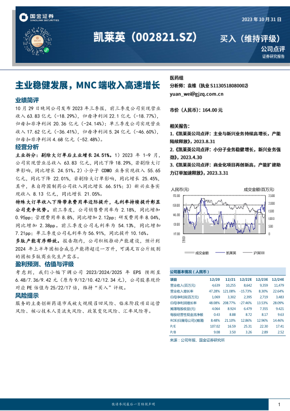 本报告对凯莱英2023年三季报进行了简评,核心观点如下:
