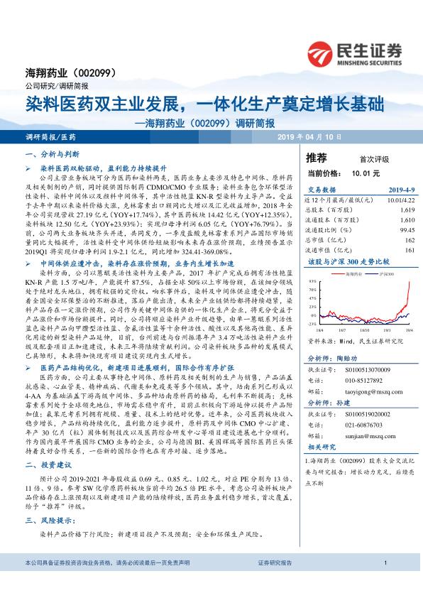 海翔药业(002099)凭借其医药和染料双主业的稳健发展,在2018年取得了显著的业绩增长,并预计在2019年第一季度继续保持强劲的增长势头。公司在染料领域拥有全球领先的市场份额和定价权,受益于行业供给侧改革和环保趋严带来的涨价预期。同时,公司积极拓展染料产品线,加速新建项目建设,为内生增长注入动力。在医药业务方面,公司通过产品结构优化、培南和克林霉素等核心产品的市场优势,以及与国际医药巨头的深度合作,实现了盈利能力的持续提升和国际市场的有序扩张。多个新建医药项目进展顺利,将进一步巩固公司的市场地位和技术优势。尽管存在染料价格波动、项目投产不及预期以及安全环保等风险,但综合来看,公司凭借其一体化生产优势、多元化产品布局和持续的创新能力,展现出良好的投资价值和未来增长潜力。民生证券首次覆盖并给予“推荐”评级,反映了对公司未来发展的积极预期。