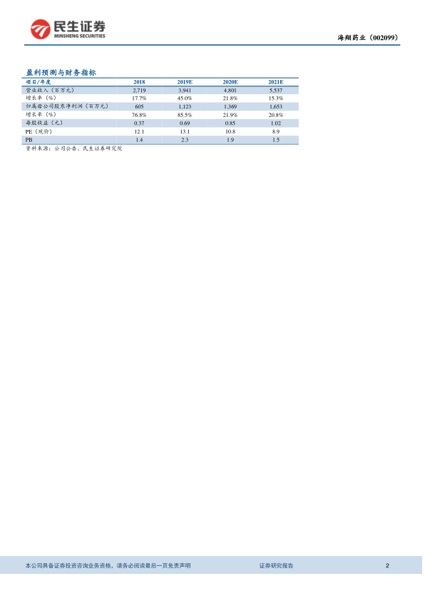 基于对公司双主业发展的深入分析,民生证券对海翔药业的未来业绩进行了预测。预计公司2019年至2021年的每股收益(EPS)分别为0.69元、0.85元和1.02元。对应当前股价(10.01元),PE估值分别为13倍、11倍和9倍。