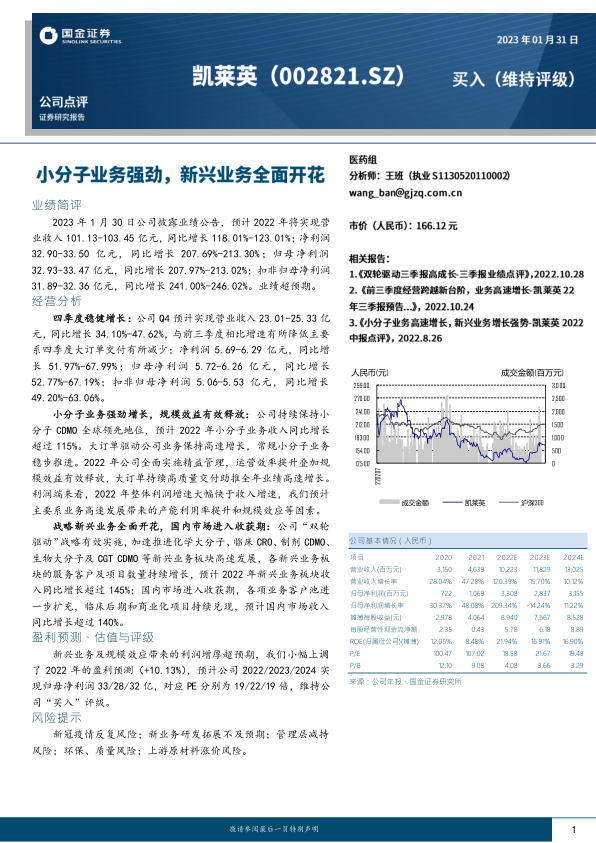 凯莱英2022年业绩表现亮眼,营收和净利润均实现大幅增长,超出市场预期。小分子CDMO业务的强劲增长是主要驱动力,同时公司积极拓展新兴业务,国内市场也进入收获期。“双轮驱动”战略的有效实施和精益管理带来的运营效率提升,共同推动了公司业绩的高速增长。报告上调了公司盈利预测,并维持“买入”评级,但同时也提示了相关风险,包括疫情、研发、管理层变动、环保质量以及原材料价格波动等。