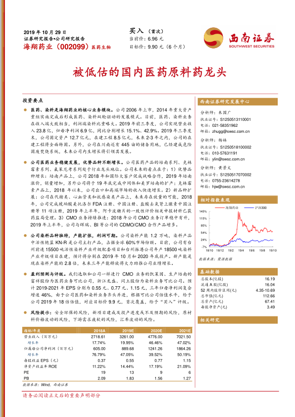 海翔药业作为国内医药原料药和染料领域的龙头企业,凭借其双轮驱动的业务模式、独特的产品优势和持续的产能扩张,展现出强劲的增长潜力。医药业务稳健发展,染料业务则受益于行业高景气度和公司自身的竞争优势,未来业绩可期。在建工程转固后,公司产能将大幅提升,有望再造一个海翔。综合考虑公司基本面和行业发展趋势,给予“买入”评级。